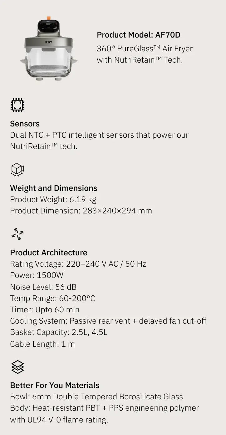 LUMA is the only air fryer in India with a fully transparent PureGlass™ bowl, silent 56 dB operation, dual-bowl flexibility (2.5L & 4.5L), and our NutriRetain™ & Neurokeep Technology for crisp, even cooking.
